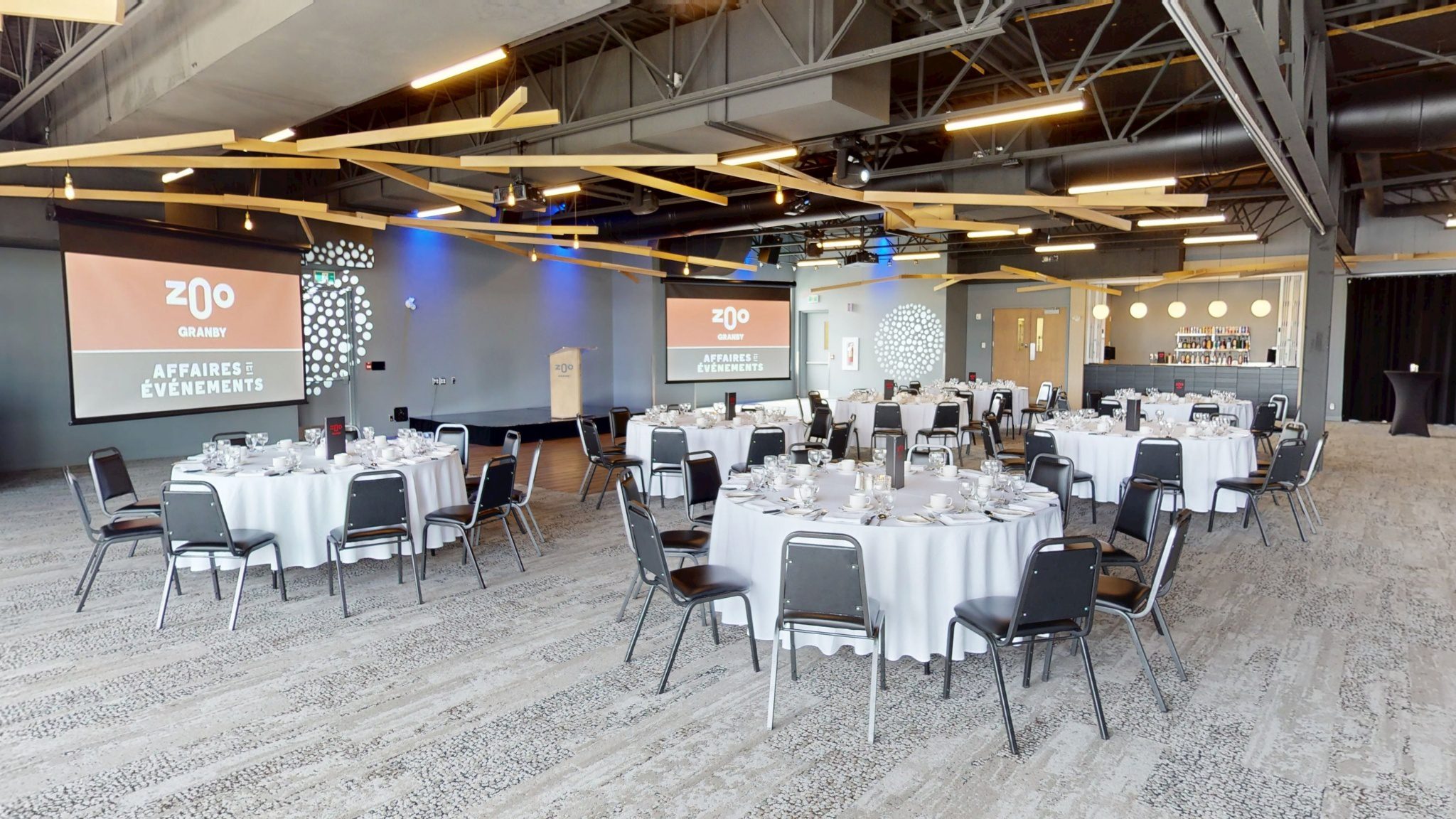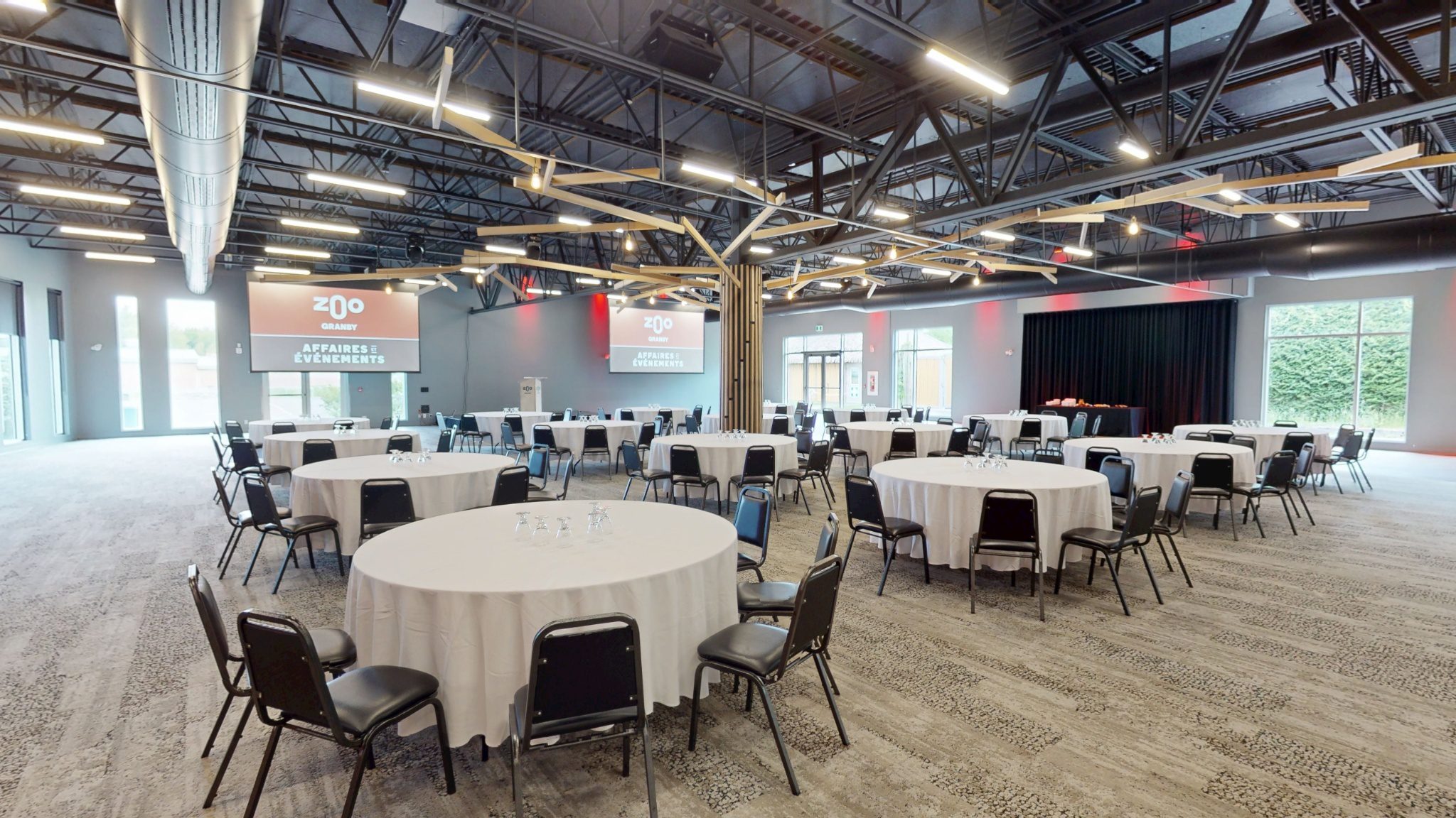 La salle Mumba est la plus grande du Zoo de Granby et peut accueillir jusqu’à 450 invités en formule banquet.