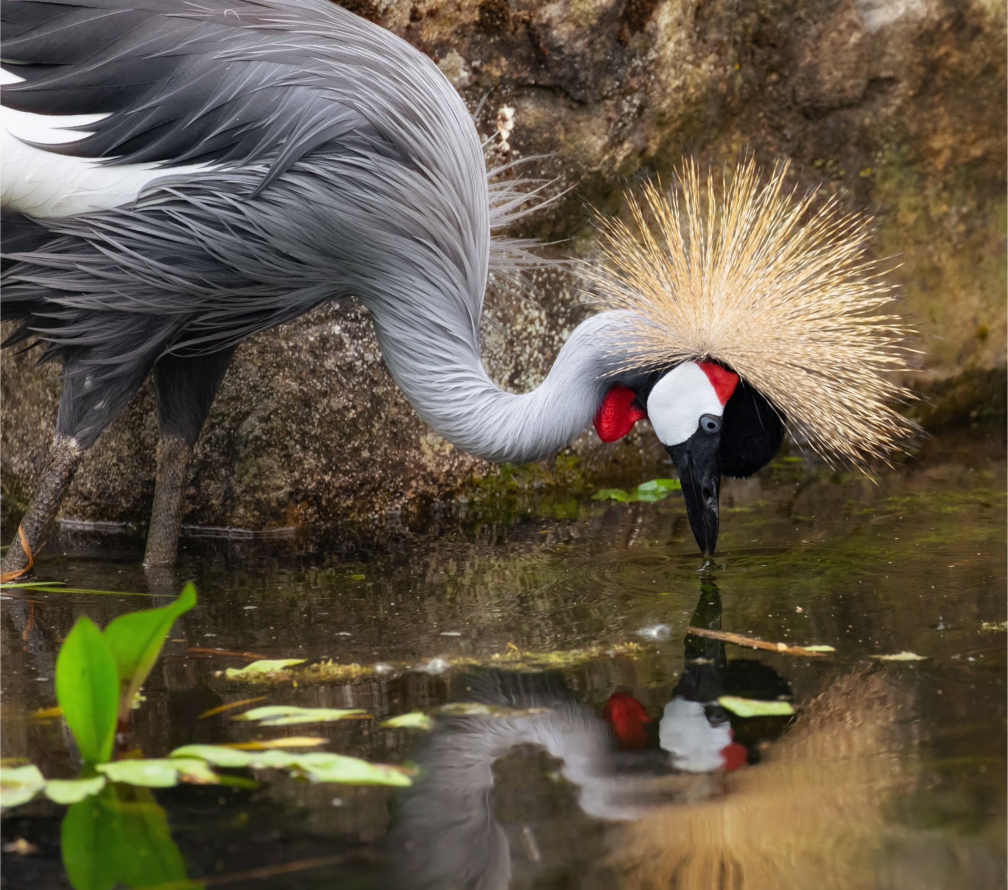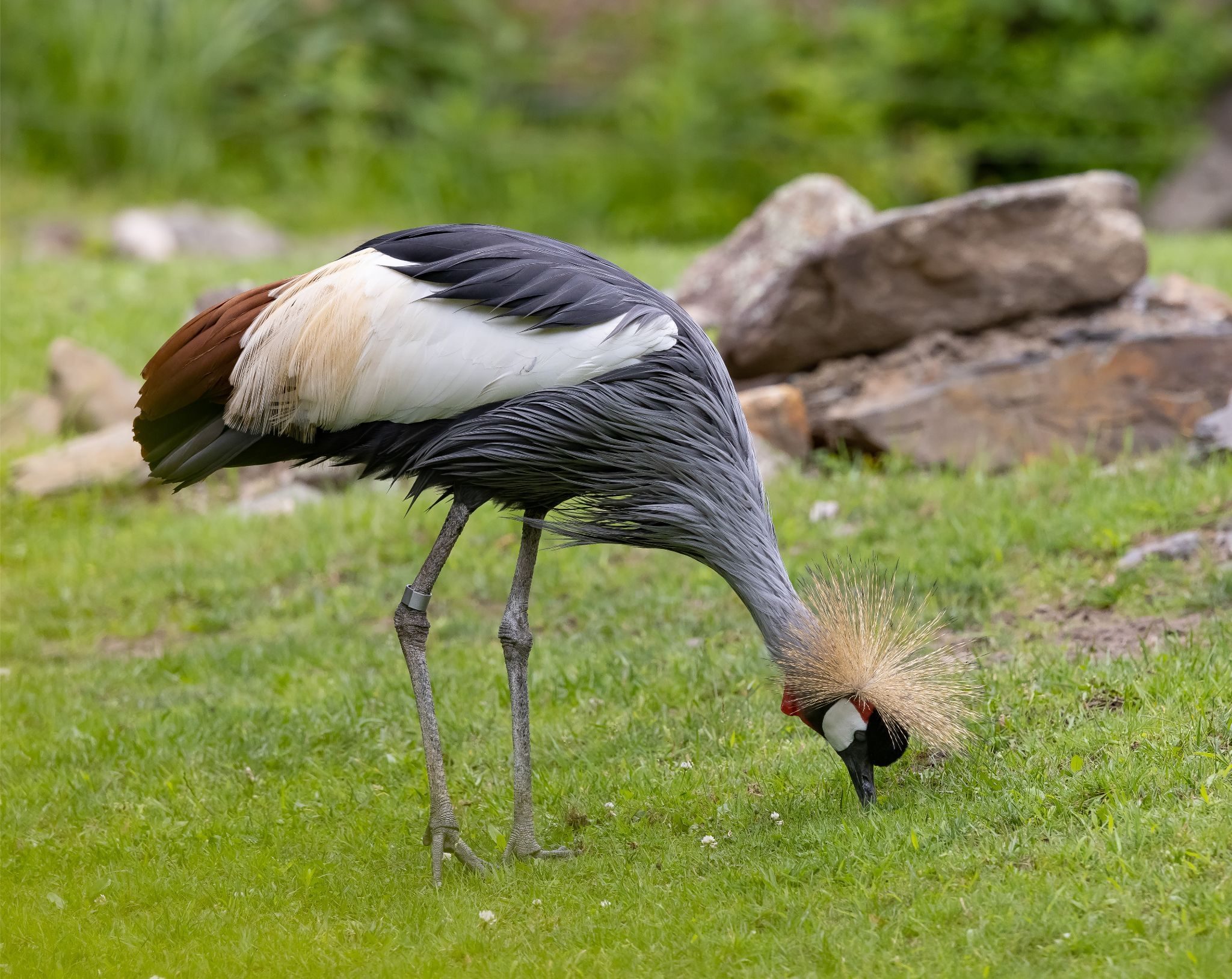 Fréquentant principalement les berges de rivières, les prairies innondées et les marécages, la grue couronnée voit son régime alimentaire teinté par son milieu de vie. Il se compose de jeunes pousses, d'amphibiens, d'invertébrés, d'insectes et de graines de carex.