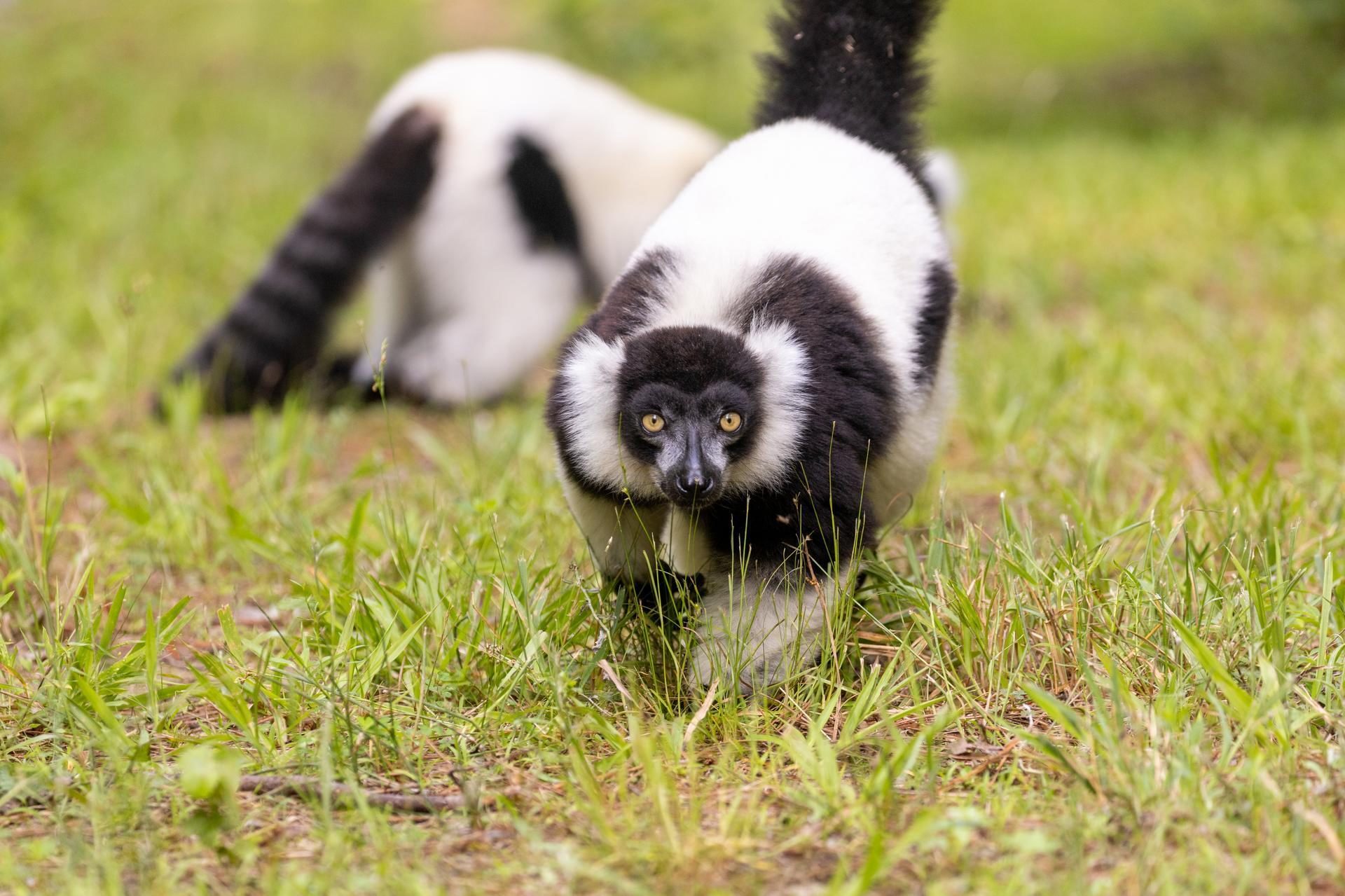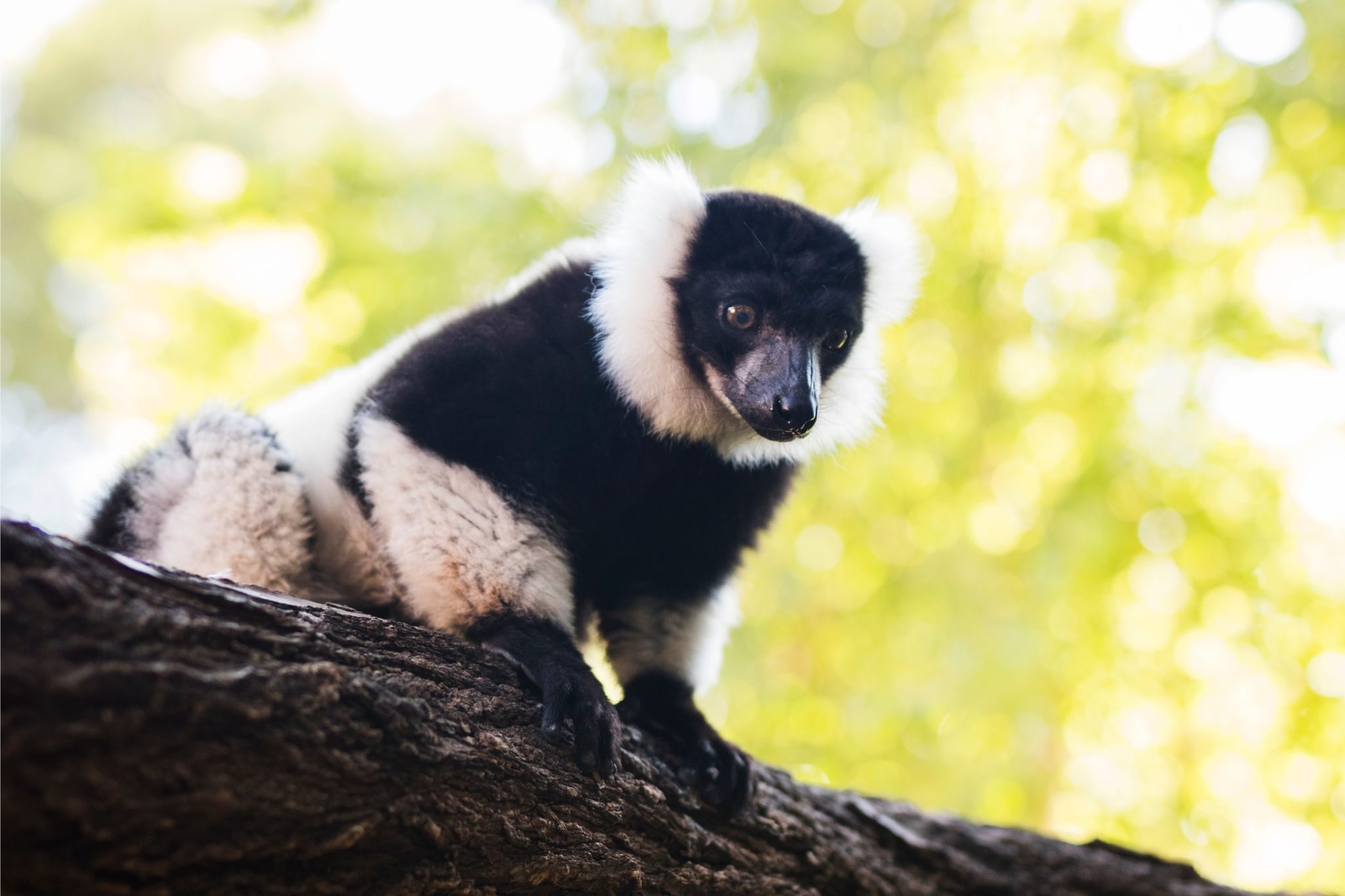 Its large, powerful legs end in prehensile hands with long fingers. Its dense black-and-white fur allows it to blend perfectly into the play of light and shadow in the canopy: varecia lemurs rarely come down to the ground. To grab a fruit, they are capable of hanging by their hind legs.