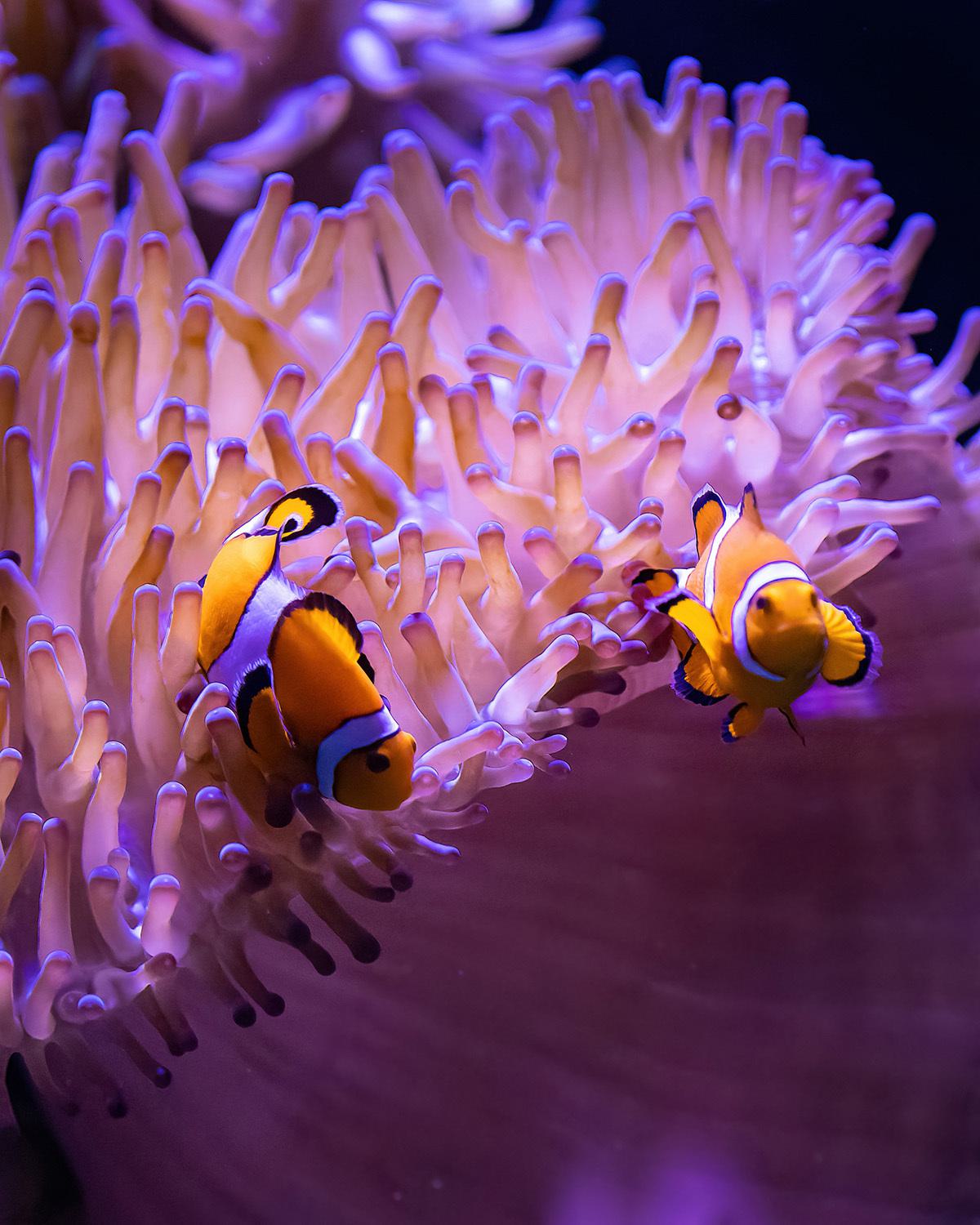Rendus célèbres notamment par le film de Disney « Le Monde de Nemo », les poissons-clowns sont des résidents permanents des récifs d’eaux chaudes de la zone Indopacifique. On en dénombre une trentaine d’espèces qui partagent toutes des caractéristiques communes : ces sympathiques petits poissons entretiennent notamment une relation mutualiste (bénéfique aux deux parties) avec une dizaine d’espèces d’anémones de mer, pourtant équipées de tentacules urticants potentiellement mortels pour d’autres poissons. Le poisson-clown bénéficie de la protection de l’anémone et en contrepartie, le poisson coloré augmente la circulation d’eau (aération) autour des tentacules et attire, par ses couleurs vives, de petits poissons qui servent de nourriture à l’anémone.