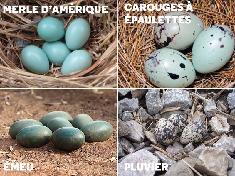 Pour quelque chose de plus exotique, l’émeu d’Australie ne donne pas sa place : ses gros œufs de 13 cm de long (jusqu’à 700 g) sont d’un beau vert foncé légèrement bleuté.