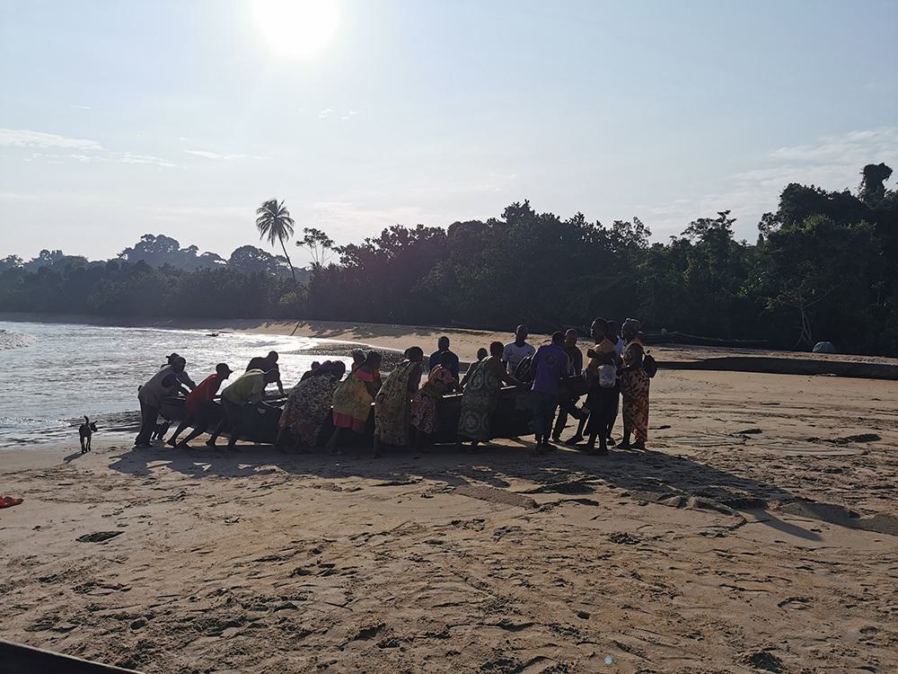- 17h00 : C’est l’heure du souper, car dans une heure, il fera noir. Au menu, pas une grande diversité, mais ce qu’il faut pour se remplir le ventre : riz avec sauce aux arachides et sardine, couscou avec sauce aux arachides et sardine, ou spaghetti avec sauce tomate et sardines! En extra, il est arrivé quelques soirs que les gars sortent pêcher! Nous avons donc pu ajouter des crevettes aux haricots du matin et faire du poisson et crabe bouilli! J’ai appris à manger le poisson à la Camerounaise, mais je ne suis pas encore prête pour les crevettes et les crabes qu’on mange en entier avec l’exosquelette….