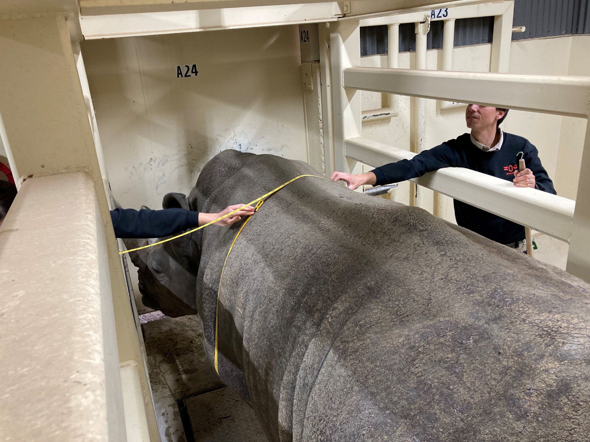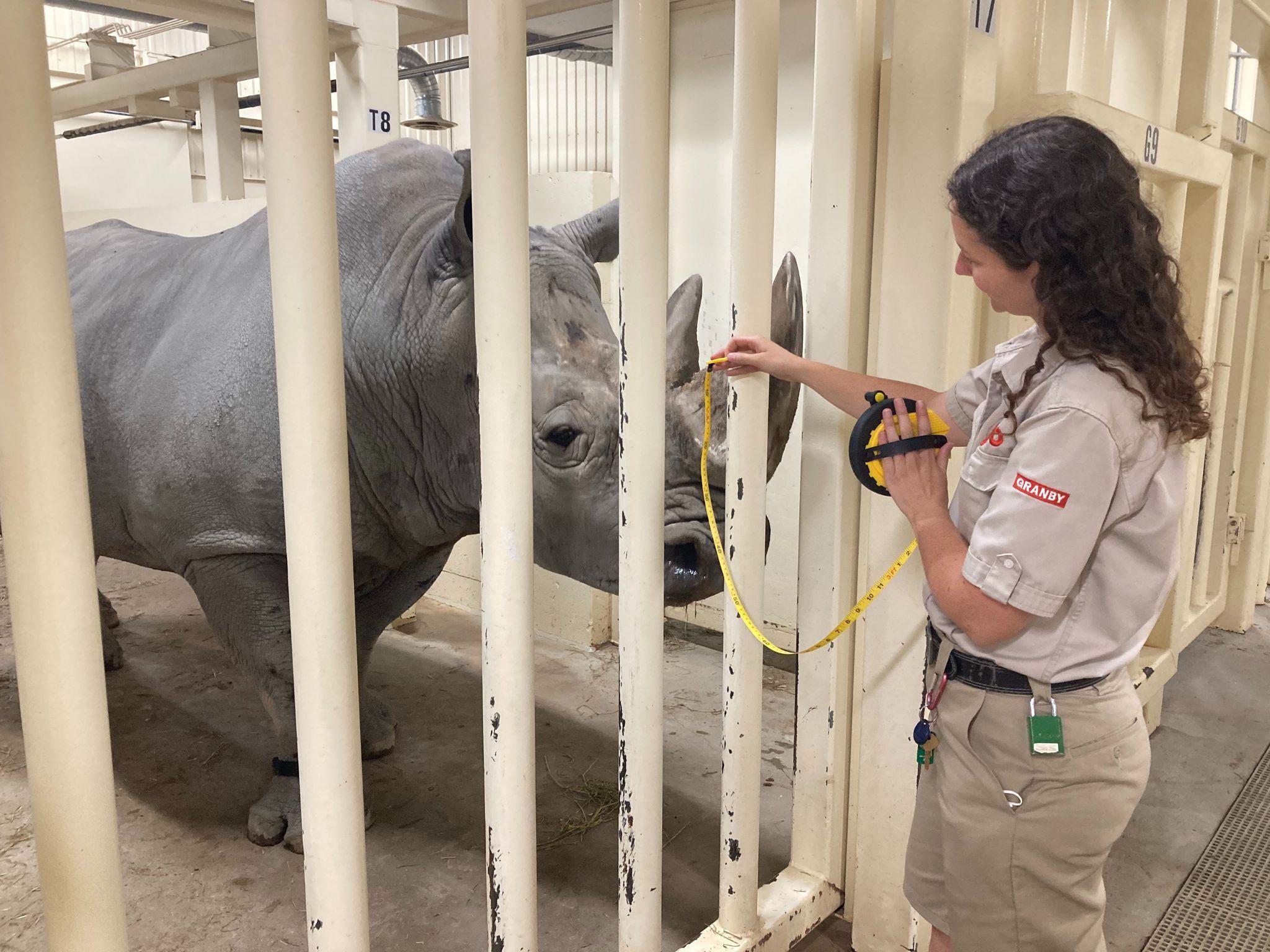 Entre le 6 et le 10 janvier dernier, une étudiante à la maîtrise du George Mason University, est venue prendre les mesures morphométriques de nos rhinos (longueur, hauteur), récolter des données sur l’activité cardiaque des gros mammifères et mesurer leur état de chair, en plus de procéder à la pose du bracelet GPS et observer leur niveau d’activité quotidien. Cette dernière sera de retour à l’été 2023 afin de collecter les mêmes données et de comparer les résultats entre l’été et l’hiver.