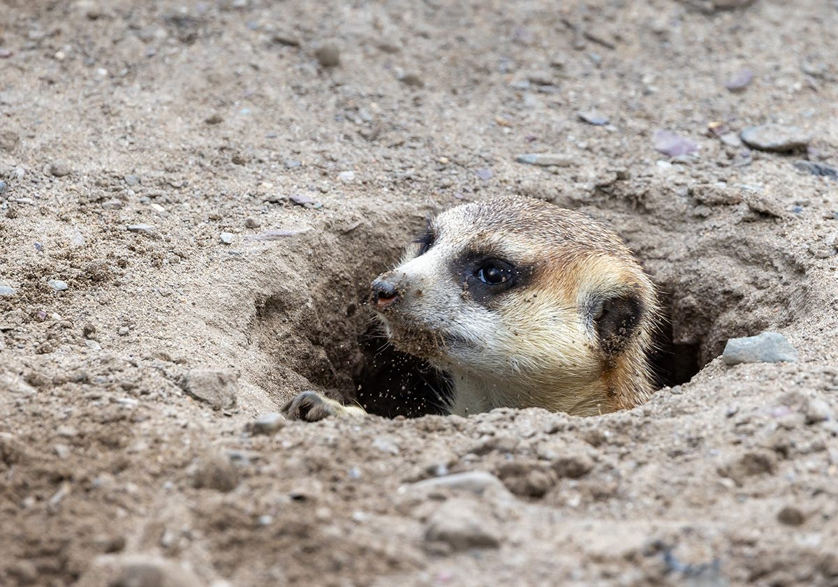 Petit animal au corps effilé avec une tête allongée, il se faufile avec aisance dans les galeries de son terrier : et le suricate ADORE creuser!