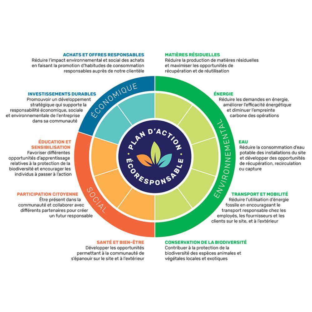 Pour atteindre ses objectifs, le Zoo de Granby s'est doté d'un plan d'action en développement durable qui guide chacune de ses initiatives, de ses réflexions, de ses actions. En un coup d'oeil, voyez l'ensemble des dimensions sur lesquelles travaille le Zoo dans sa démarche écoresponsable.