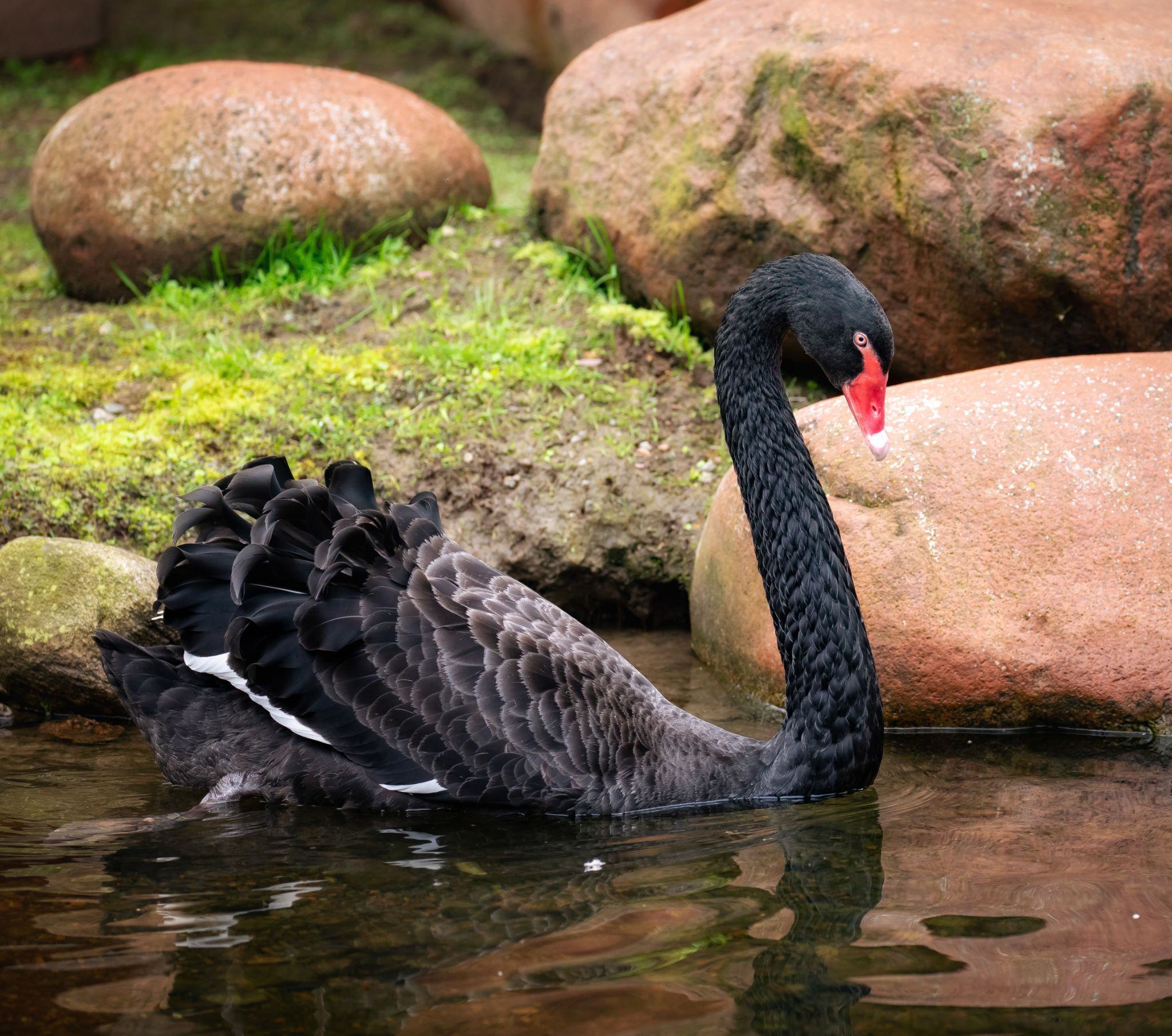 The only black-feathered swan species, its dark plumage is only ever interrupted by a few white feathers showing through when it flies