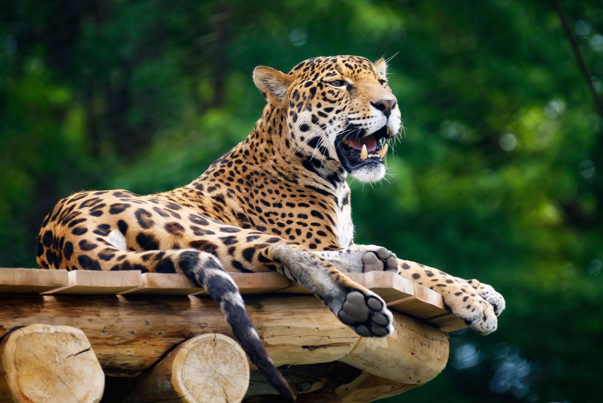 Jaguars don’t capture their prey by speed but rather by surprise. Tapirs, armadillos, anteaters, capybara, caimans and turtles are among their prey, as well as several species of monkeys and deer. Their jaws can close with a pressure of 500 kg/cm2.