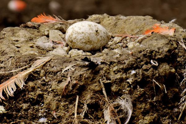 Flamingos build mound-like, conical nests made from a mixture of mud, small pebbles, straw and feathers.