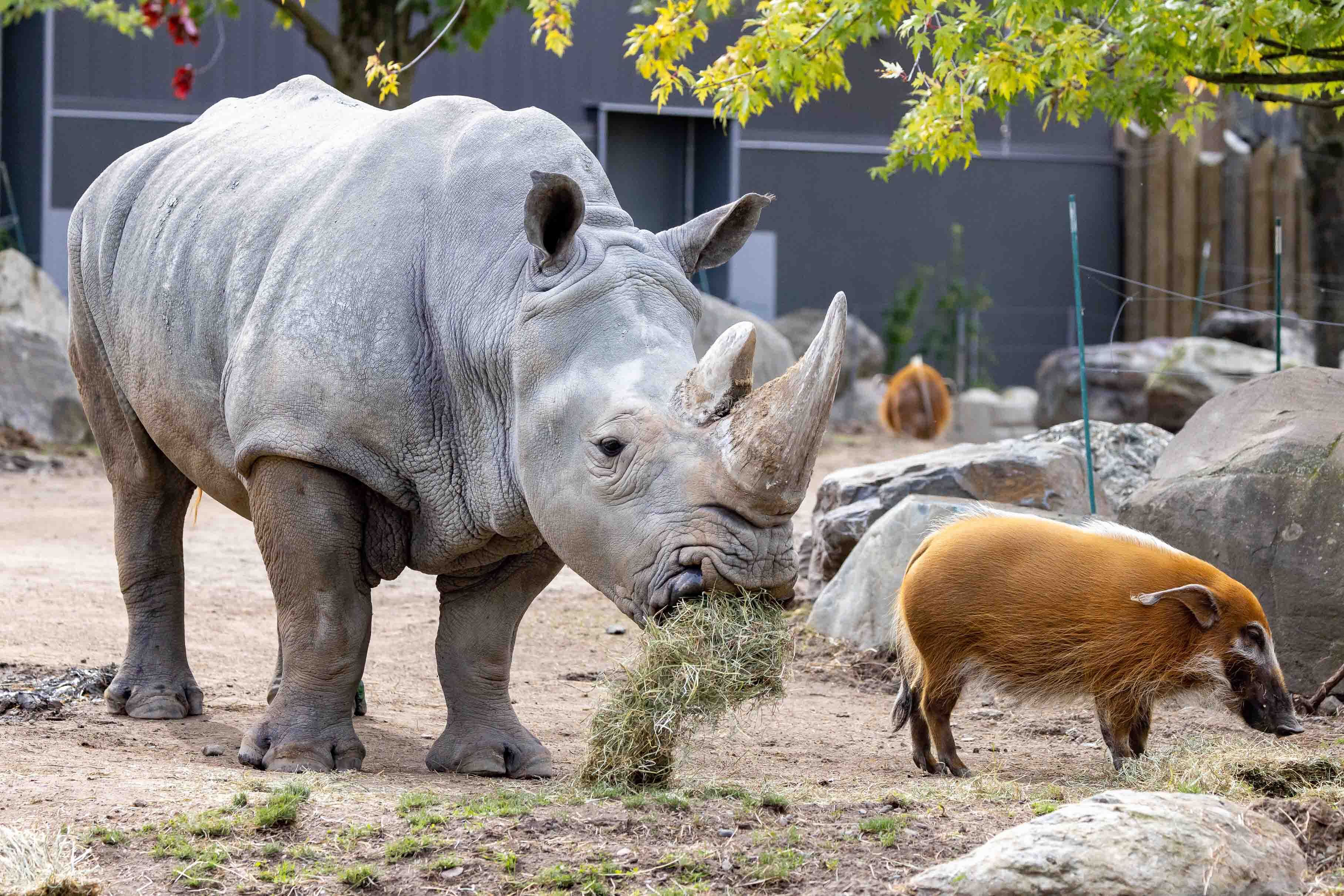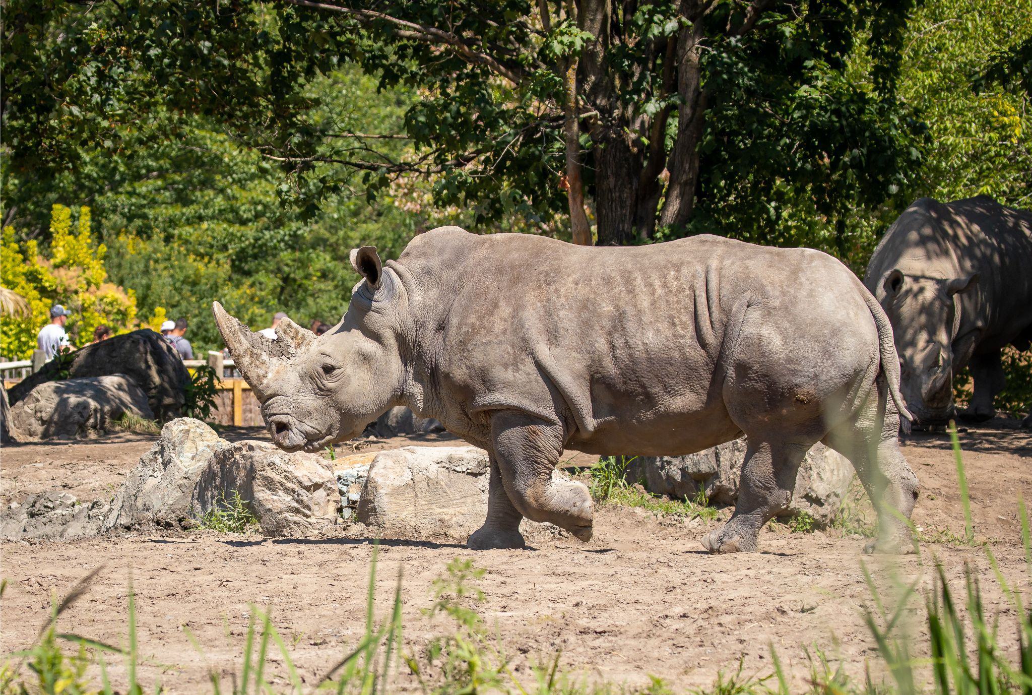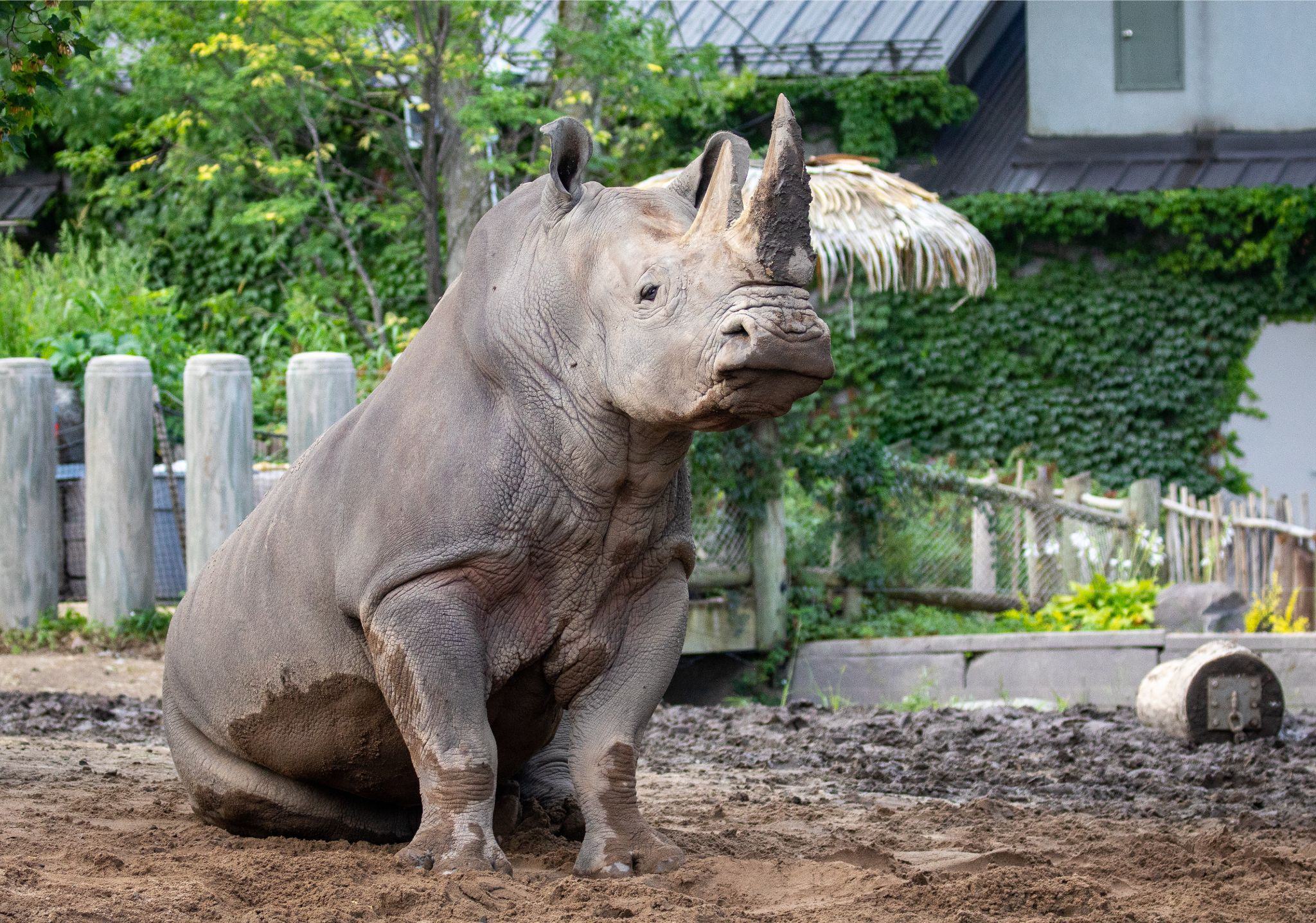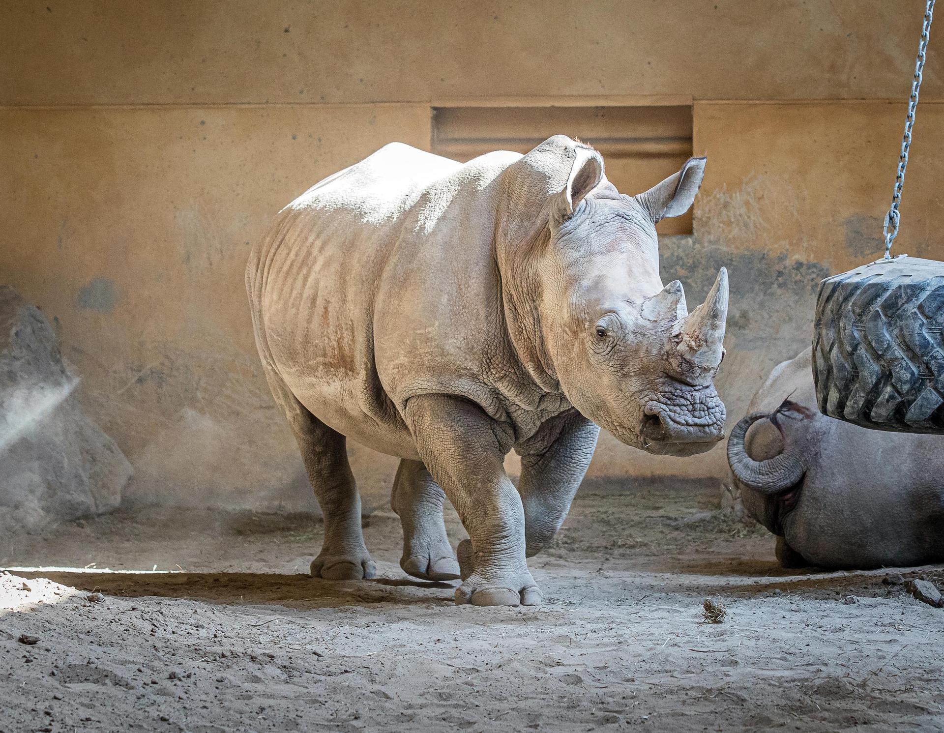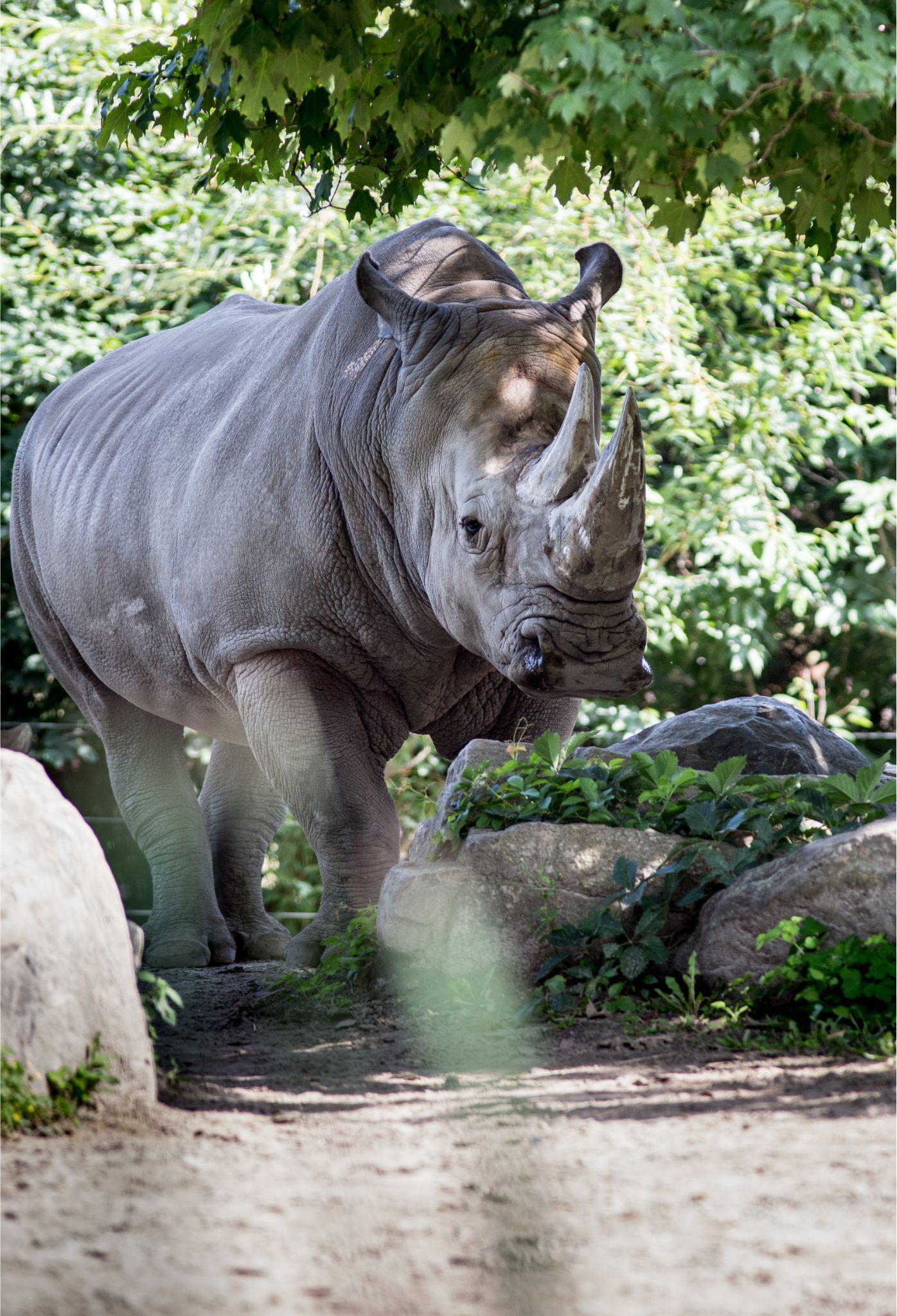 Le rhinocéros est un pachyderme, soit un animal à la peau très épaisse : jusqu'à 4,5 cm par endroit! Ses deux cornes, faites de kératine, poussent tout au long de sa vie : celle sur le bout du nez est toujours plus longue. Les rhinocéros raffolent des bains de boue qui, en séchant, protègent la peau du soleil et des piqûres d'insectes.