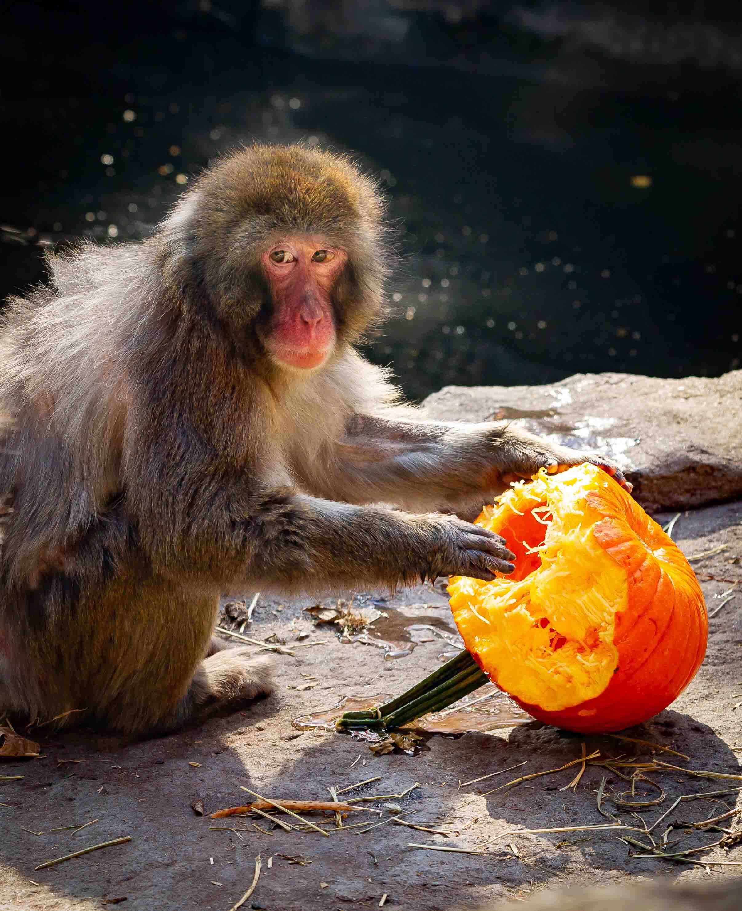 Plusieurs espèces hébergées au zoo profitent de l'abondance de citrouilles pour égayer leur menu...
